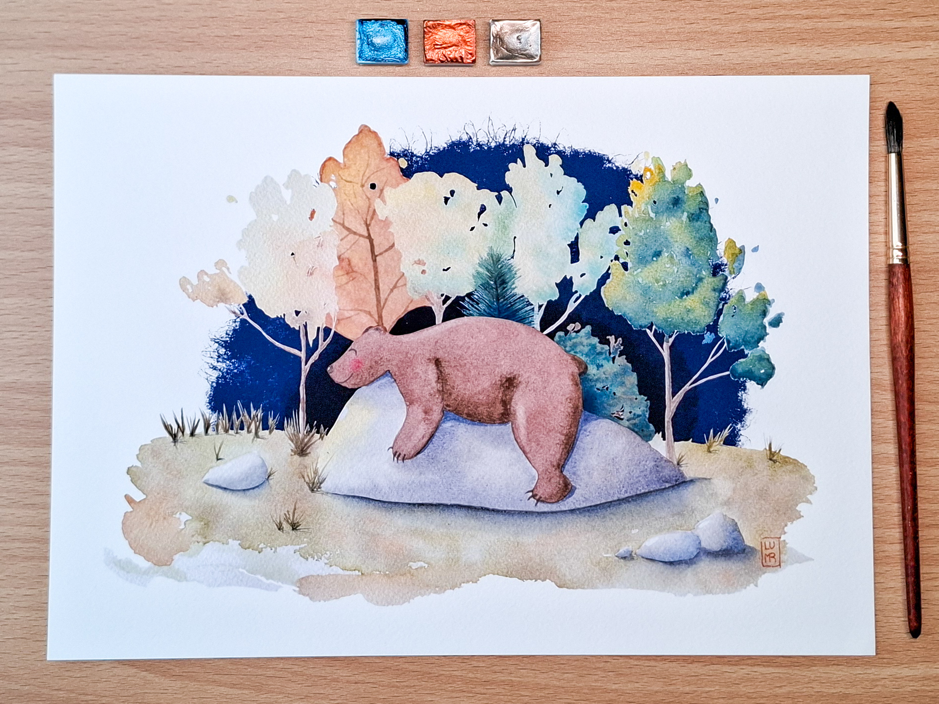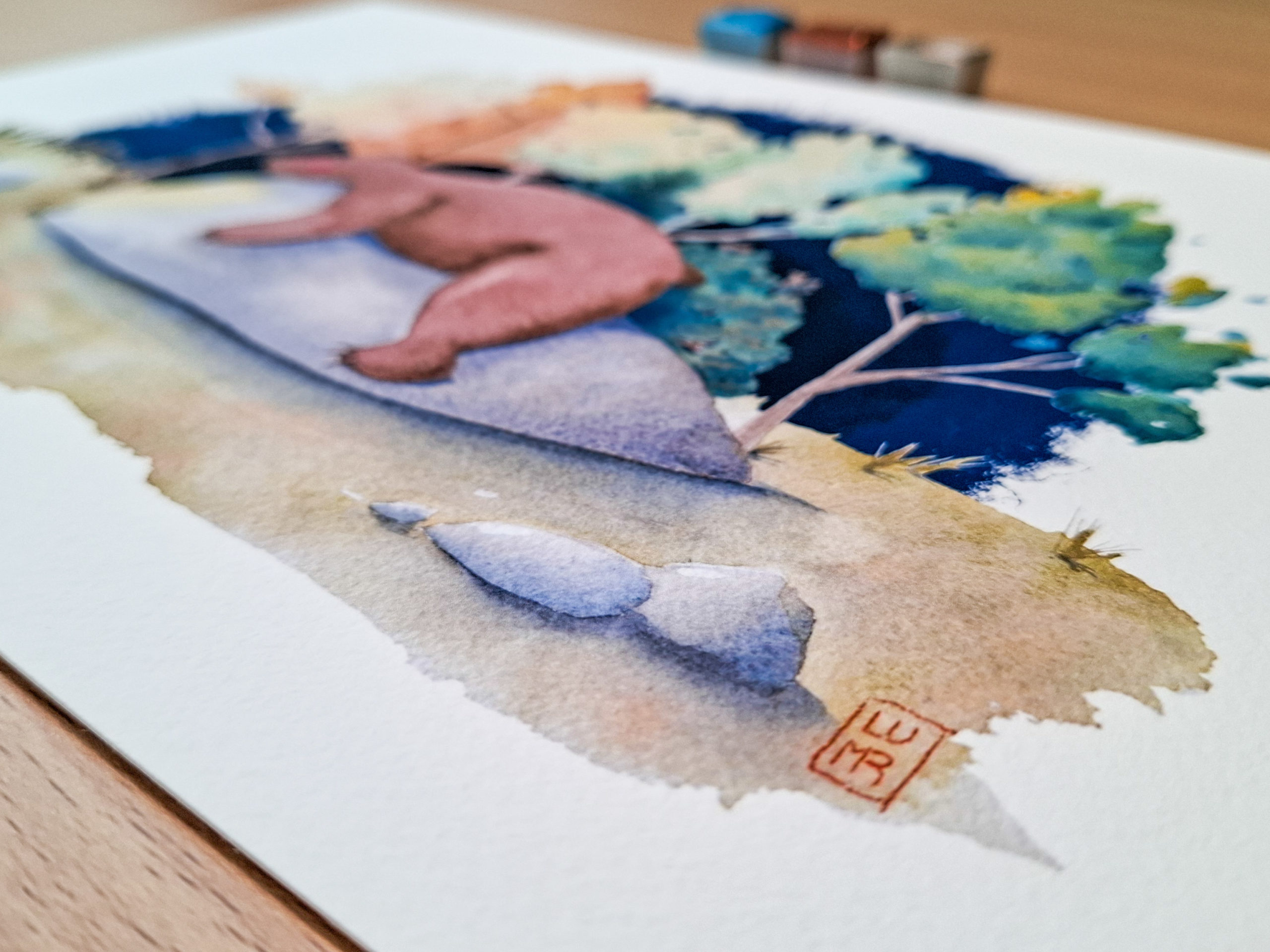 L’illustration est issue d’une aquarelle originale réalisée à la main, puis imprimée avec soin sur papier d’art, afin de restituer la finesse des couleurs et la texture de la peinture.